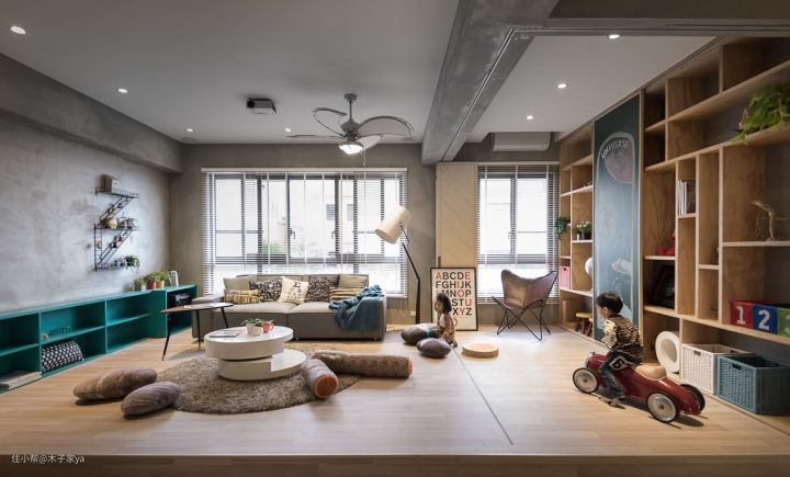 尺寸注意事项:沙发和电视柜等家具的尺寸建议尽量购买没有锐角,轻便方便挪动,尤其是茶几。可以随时挪出给宝宝玩耍的空间。阅读区的家具尺寸尽量低矮,高度在1米以下,适合幼儿拿取方便。过道空间的尺寸要预留80cm以上,相对于一般的通道要宽敞,防止宝宝乱窜磕碰到。