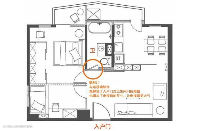 1. 入户门和卫生间之间的距离要足够长,这样在卫生间门口做了隔断之后才不会影响室内通透性;