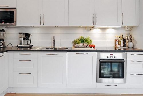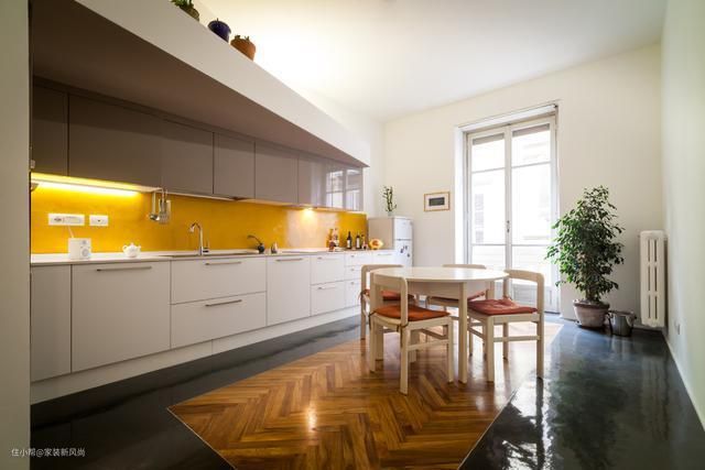 同样地,对面墙体亦在橱柜底部巧妙安置了几个必要的插座。在这种情况下,会有一小部分柜体被开关、插座或线缆占用,而不再能很好地用来储存,不过这恰恰可以让我们很方便地在橱柜底部安装led条状装饰灯——让操作台变得更明亮亦使厨房多一点情调。