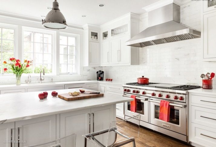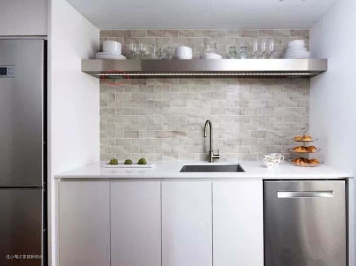 你可能觉得图中厨房没有可用的电源插座,其实不然,如果你仔细看,你会惊奇地发现,插座和开关都被巧妙地置于钢架下面了(红色椭圆处)!这样既不会破坏墙体装饰的完整美又能用着顺手,而且还会给别人一种神秘之感。
