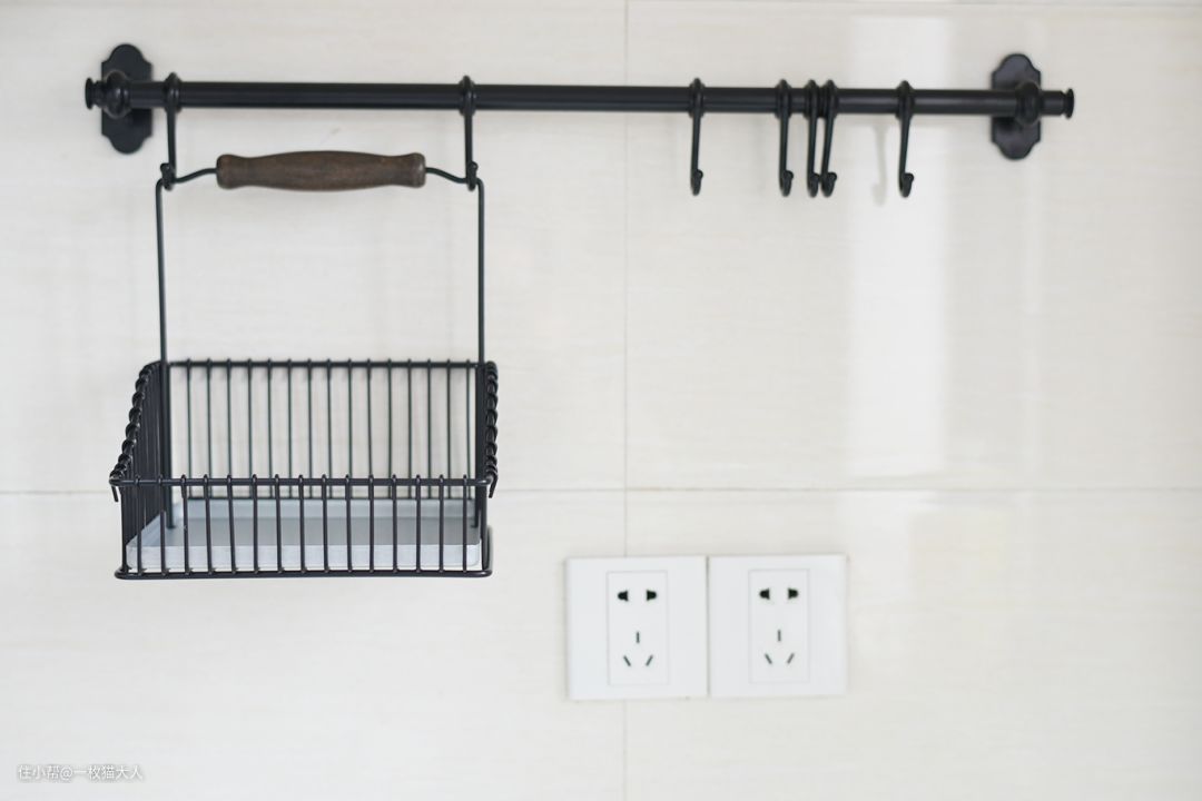 位置确定为灶台右手边,方便取放烹饪工具和调料,因为油烟机右侧的墙面不到70cm,所以我选择了57cm的小号挂杆,再配上挂钩和一个放酱醋瓶的网篮,整套下来才120块,性价比很高。