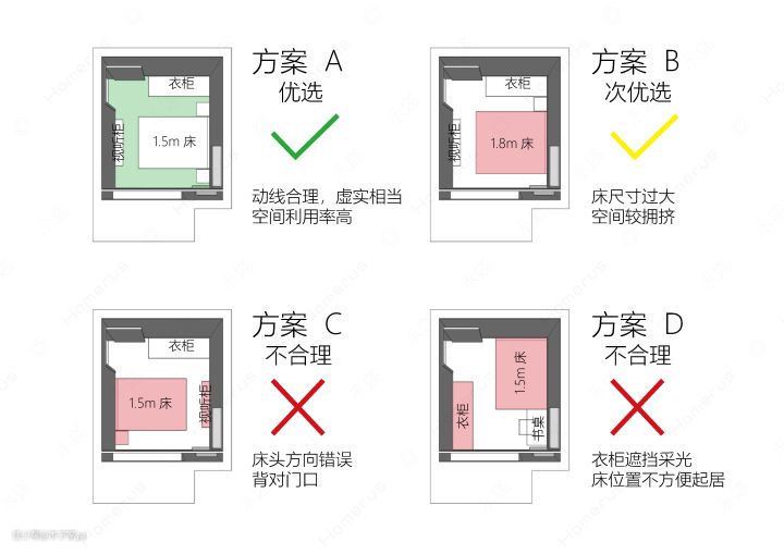 缺点:这样的卧室面积是绝大部分中国卧室平均面积,可以配备1.8米的床,左边放床头柜,高度建议在50-70cm,右边放梳妆台,高度70-120cm这样搭配和谐,再搭配上衣柜基本上就可以了。很多人容易把各种家具往里面堆的满满才算好,要适当留空。