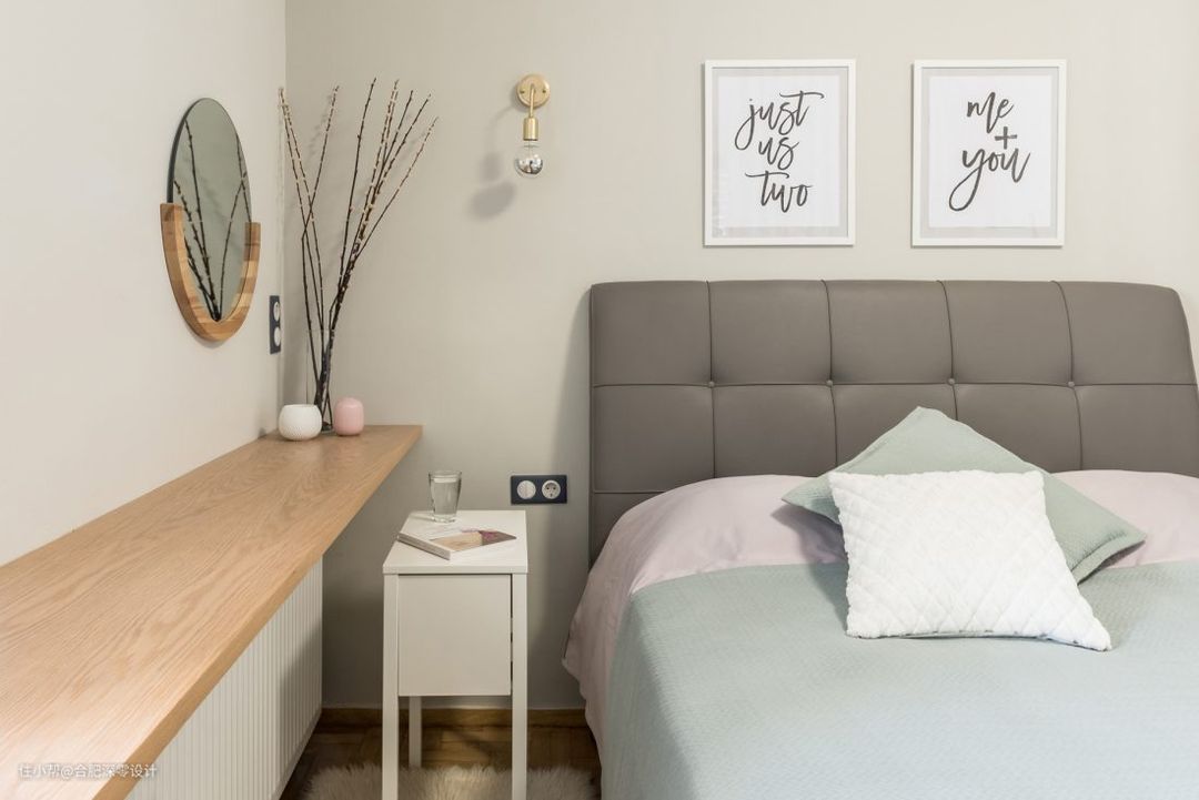 在南方大多数人家都有安装暖气片,孤零零在墙上显得太抢眼怎么办呢?加块置物板就能解决你的烦恼,正如她家卧室,上面还能用来摆放一些杂物,甚是还能充当梳妆台。