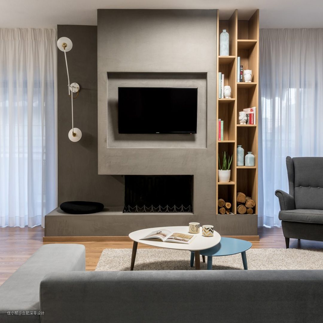 不同于我们常见的客厅设计,电视背景墙由水泥浇筑而成,一侧用实木打造成的储物空间,多个格子能够做到更好的分类收纳。左边的留白采用壁灯装饰,光线要是不满意,上下调节一下就好了。