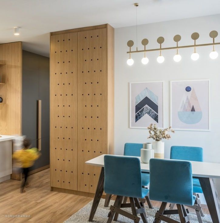 餐桌摆放在过道另一侧,金色的吊灯以及蓝色丝绒材质的餐椅,让家的质感在无形之中得到升华,旁边的柜子是一大亮点,门板的洞洞起到的作用,不仅仅是为了让柜内通风,插上置物板,柜门也是可以用来收纳的,犹如洞洞板。