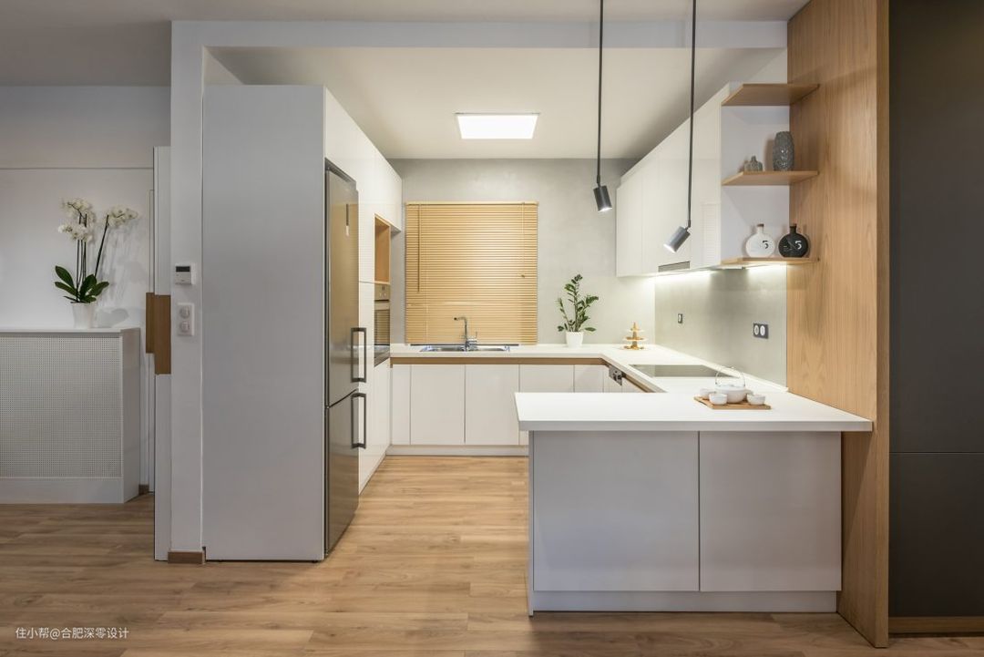 往前走,就来到厨房,冰箱、蒸烤箱等家电都嵌入橱柜里,看上去十分洁净整洁,灶台呈u型设计,垃圾桶刚好被藏在了最外面的灶台下方。