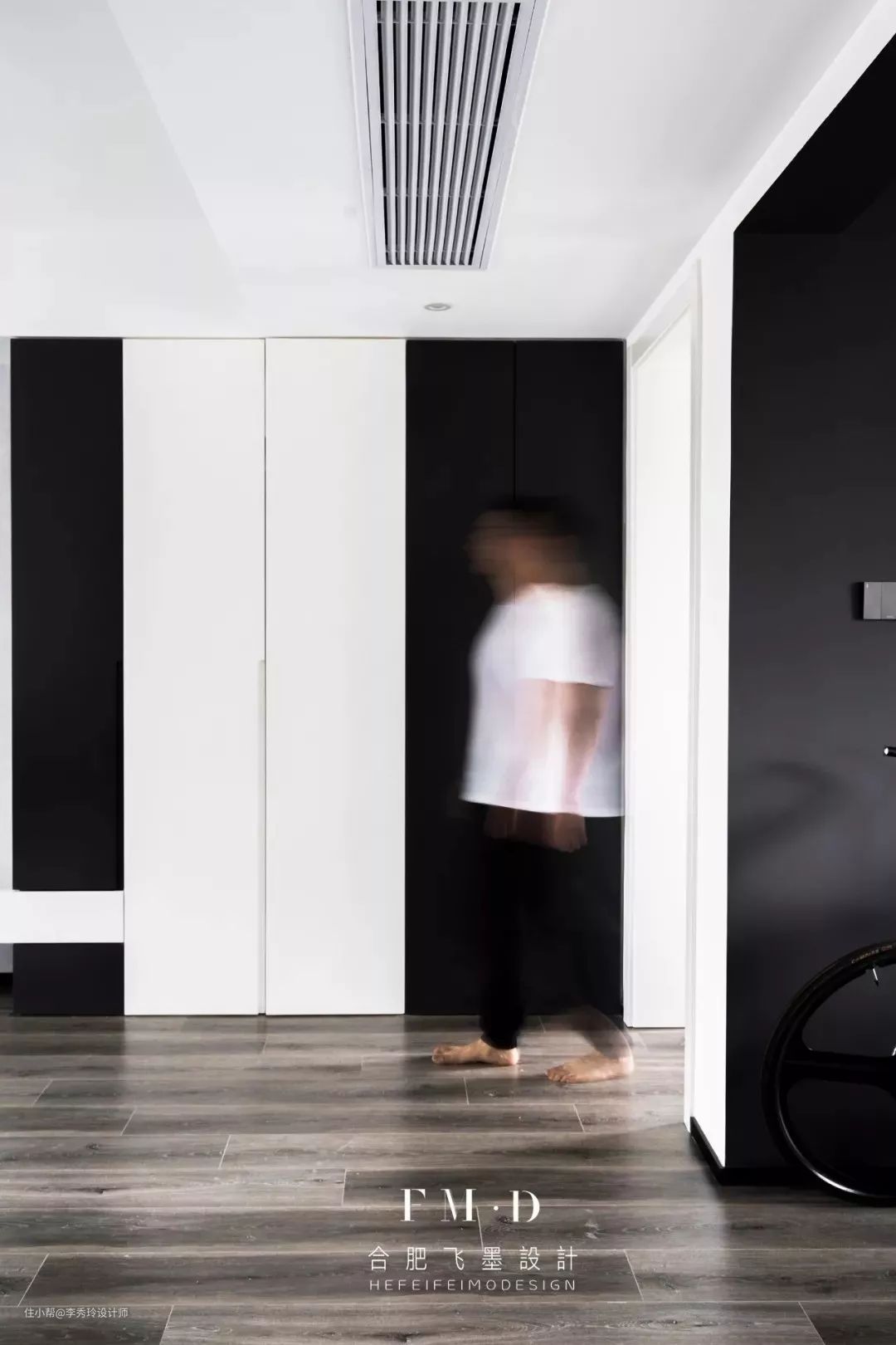 注意看图片中小哥哥的身影,他的身后就是卫生间的隐形门。顶天立地的隐形门,和左侧墙柜为一体,黑白色设计,简约大方。