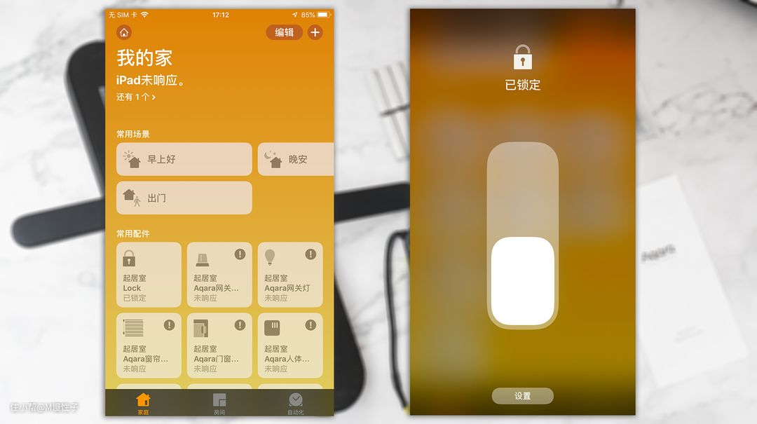 ▼同时还支持在米家和苹果homekit的app中蓝牙解锁,出于安全考虑蓝牙不可远程开锁。 下图分别是米家和苹果HomeKit的解锁界面。米家中能实现和查看的功能更多。
