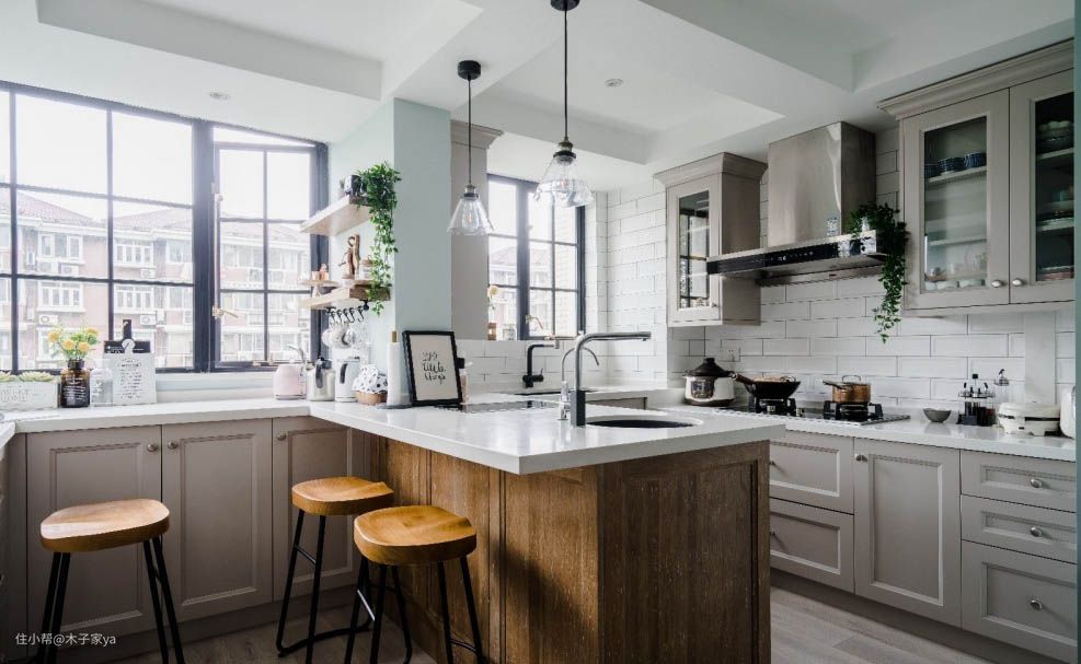 如果你家厨房面积至少15㎡,而且布局是U型、L型或二字型,那么可以考虑中西厨合并一起。把水槽安装在岛台上,台面放道具,下面放盘子,可以直接完成整改备菜流程,动线也会流畅。
