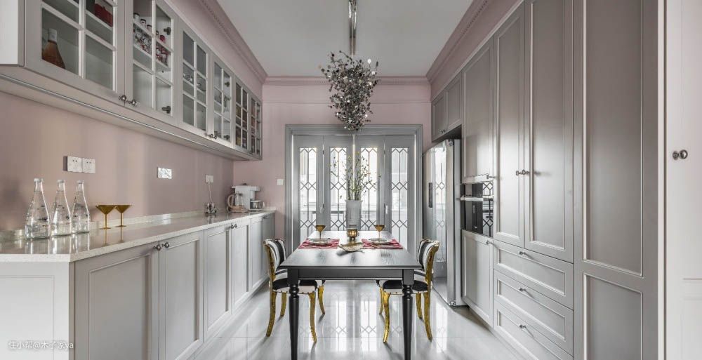 如果家里的空间实在太小,连在餐厅做一个西厨的空间都不够。那么可以考虑把餐厅的餐边柜利用起来,餐边柜当做做厨房高柜,烤箱、蒸箱纳入餐边柜,让餐厅成为西厨操作台。