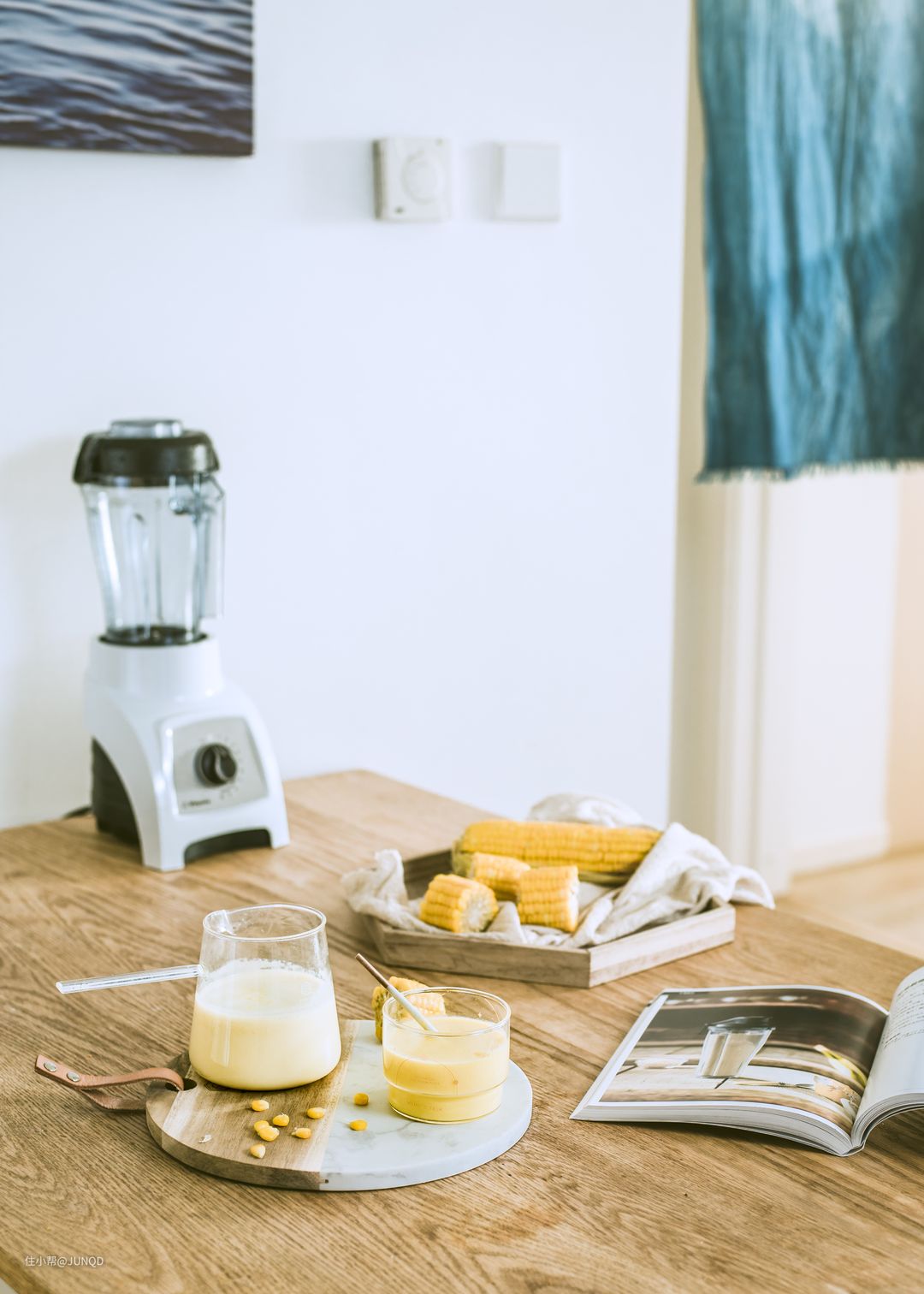 第三款饮品是奶香玉米汁,去外面饭店吃饭经常会点这款饮品,现在可以在家自己做了。玉米蒸熟后,把玉米粒剥下来,可以切成几块用刀直接切比较快一点,加一点牛奶,加水,牛奶不要加太多,会盖过玉米的味道。最高上10挡3分钟左右。做了两种,浅一点的是牛奶多的,深色的牛奶少一些。