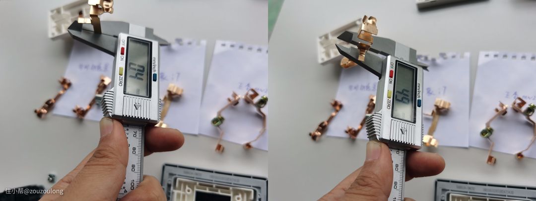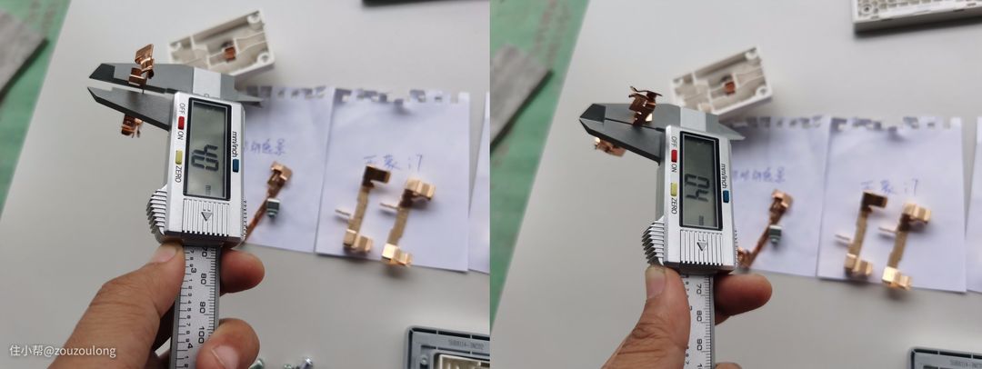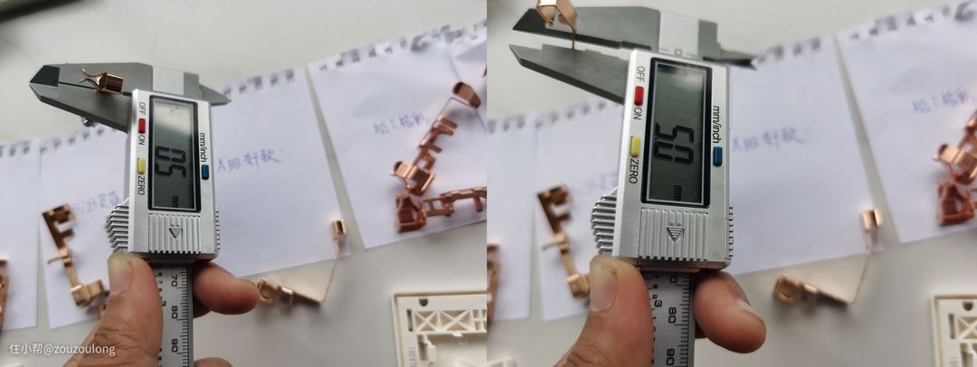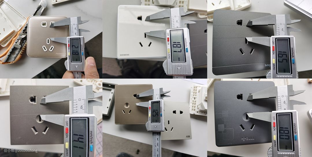 可能这样比较直观一些,载流件结构相似的罗格朗、西蒙、西门子睿致、西门子灵蕴、公牛放在一起,测量后发现西蒙和西门子睿致厚度和宽度表现较好,罗格朗稍微有点薄。