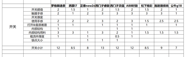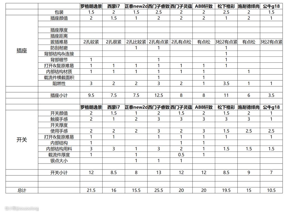 开关的颜值甚至比插座还要重要,都是要放在明面的地方,这里罗格朗、西门子睿致、ABB、施耐德颜值都不错,松下大圆板也没插座那么丑,与西蒙和西门子灵蕴等1.5分,可能我真的有点反感那个条状等杂物,所以正泰和公牛依然是1分。