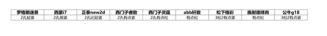 按理来说插孔的不松不紧才是最好的,除了几个比较紧的以外,其他大多是2孔有点紧而3孔比较顺,拔插的松紧程度相对有一些区别,有点松可以理解为抓力不够也可以理解为比较顺,这里表格进行了汇总而不进行打分,具体喜欢松还是紧的得看你们个人喜欢了。