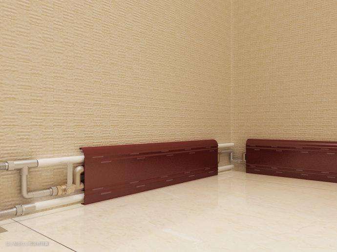 ②踢脚线里还可以做隐形采暖。它是一种利用踢脚线内置管道进行热水循环的装饰散热器,由房间四周均匀散热,传热快,节能,不占空间,不会影响原有的空间布局,是老房、小户型升级改造采暖升级的首选。它将装饰与采暖完美结合,把踢脚线应用成散热器,从外观上看和一般的踢脚线没什么区别,在铝合金踢脚线面板后面有一体式微型水管供暖,根本看不出是暖气片,而且还可以调控温度,非常高效节能。