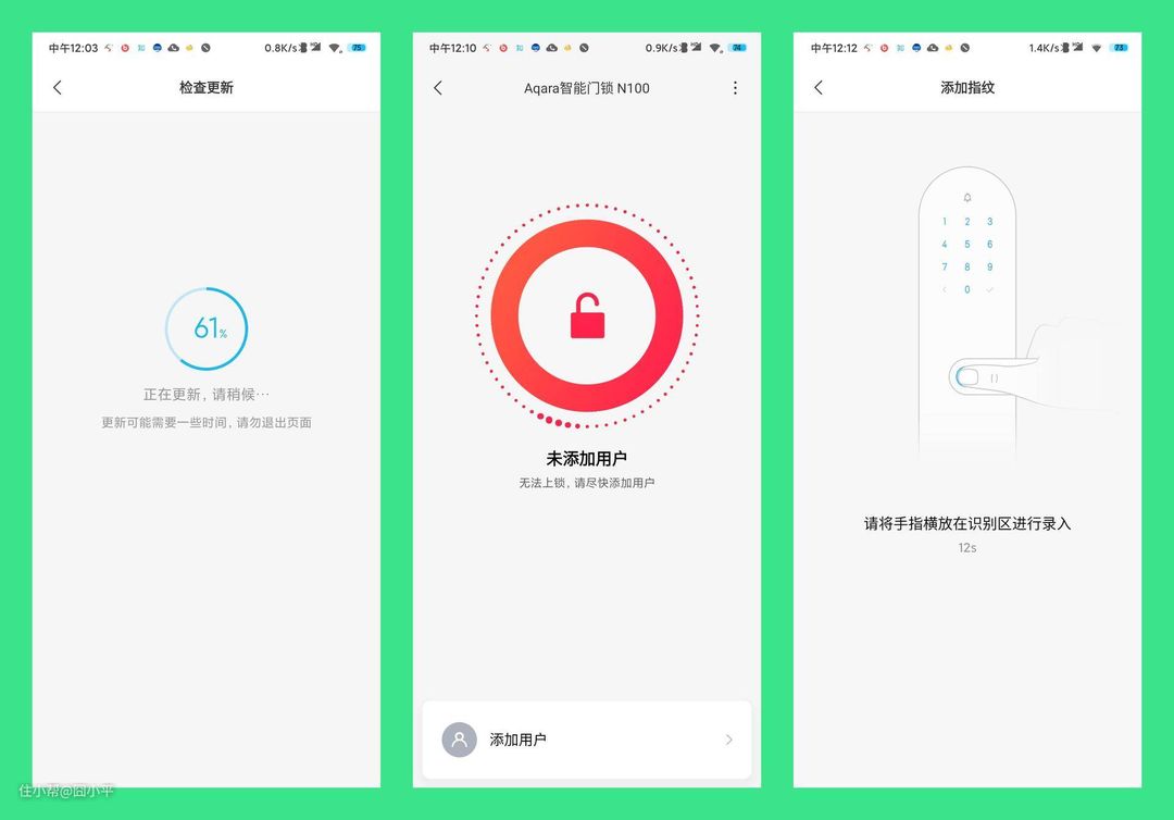 和预想中的一样,第一次使用需要更新产品固件,耐心等到就行。更新固件期间手机页面要保持在升级页面上,否则可能导致升级中断。智能门锁固件更新完毕后,就可以添加用户了。第一个用户是管理员用户,在设置完安全密码并录入一组指纹之后,基本的设置工作就完成了,智能门锁就可以用起来了。
