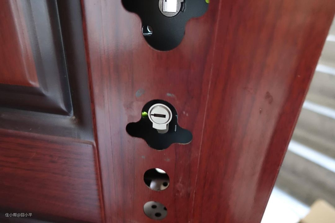 接着将Aqara N100的锁体嵌入门内,并拧好螺丝固定好。再插入锁芯。此时整个锁体的已经安装完毕了,拿出N100自带的钥匙,试一下门锁工作是否正常。