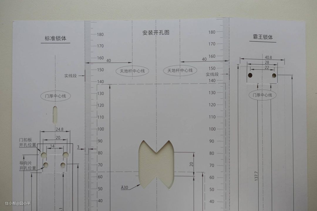 打开包装,可以看到一本使用说明书和安装开孔图。虽然安装开孔图上有霸王锁体的图纸,但其实这款产品暂时是不支持霸王锁体的。霸王锁体的用户面对智能门锁选购时确实会有太多不便,还好我家是标准锁体的。