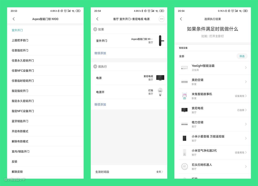比如,我这里就设置了当门从室外打开的时候,自动打开电视和客厅吸顶灯的场景。实际体验下来,感觉还是很新奇的。