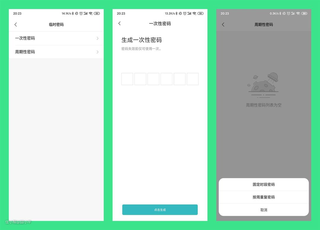 此外,为了满足某些情况下的特殊需求,Aqara N100还创建一次性密码以及周期性密码。一次性密码可以远程创建。比如家中无人快递却来了,就可以创建一次性密码并告诉快递员,同时配合家中监控保证安全。而周期性密码可以用于家中来了亲朋好友要暂住一段时间,就可以在这个周期内创建周期性密码方便亲朋好友出入家中。这两个功能真的只有遇到了某些特殊场景,才能切身体会到其方便之处吧。