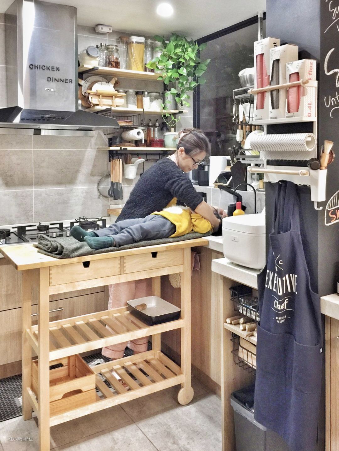 宜家的厨房推车,兼顾厨房小岛台,平时用来收纳常用的厨房用品,台面上还可以用来摘菜切菜。