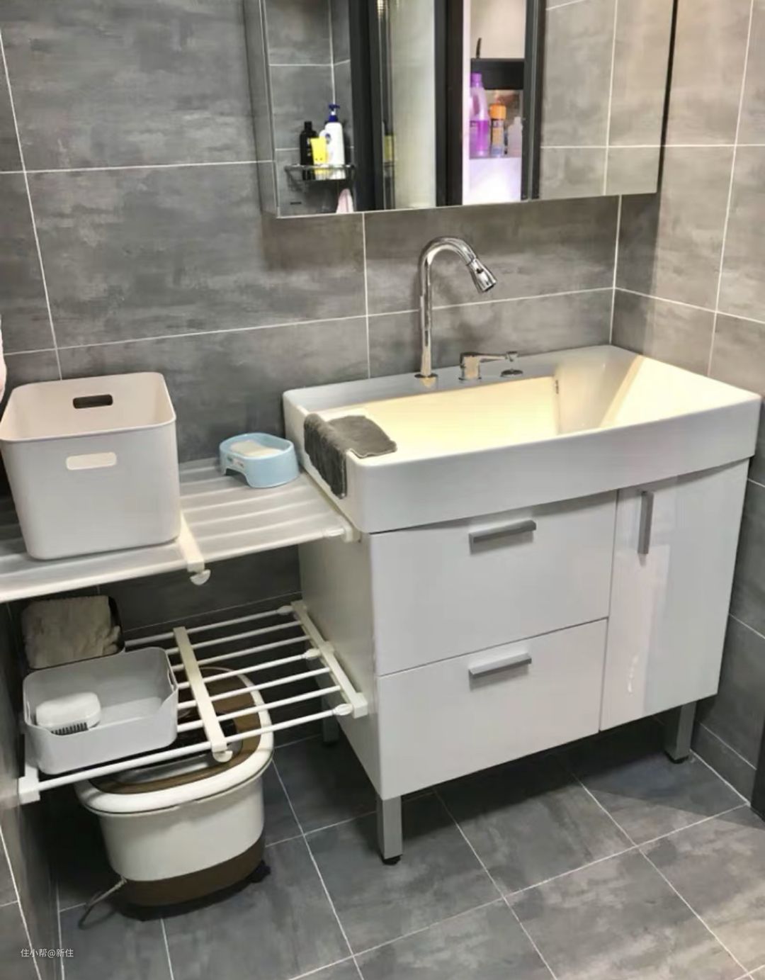 卫生间干区收纳空间不足,可以利用洗脸盆和墙面之间的距离,打造出新的空间,放置脸盆肥皂毛巾等。