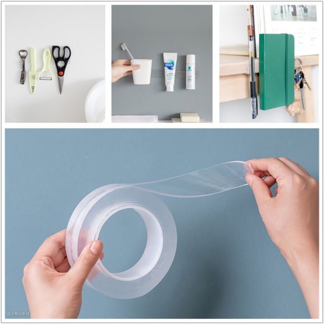 而日常生活中的纳米胶贴用途相当广泛,用来粘遥控器、牙刷杯子,粘在桌边收纳笔和本子,还可以粘贴在厨房,收纳剪刀、削皮刀等。