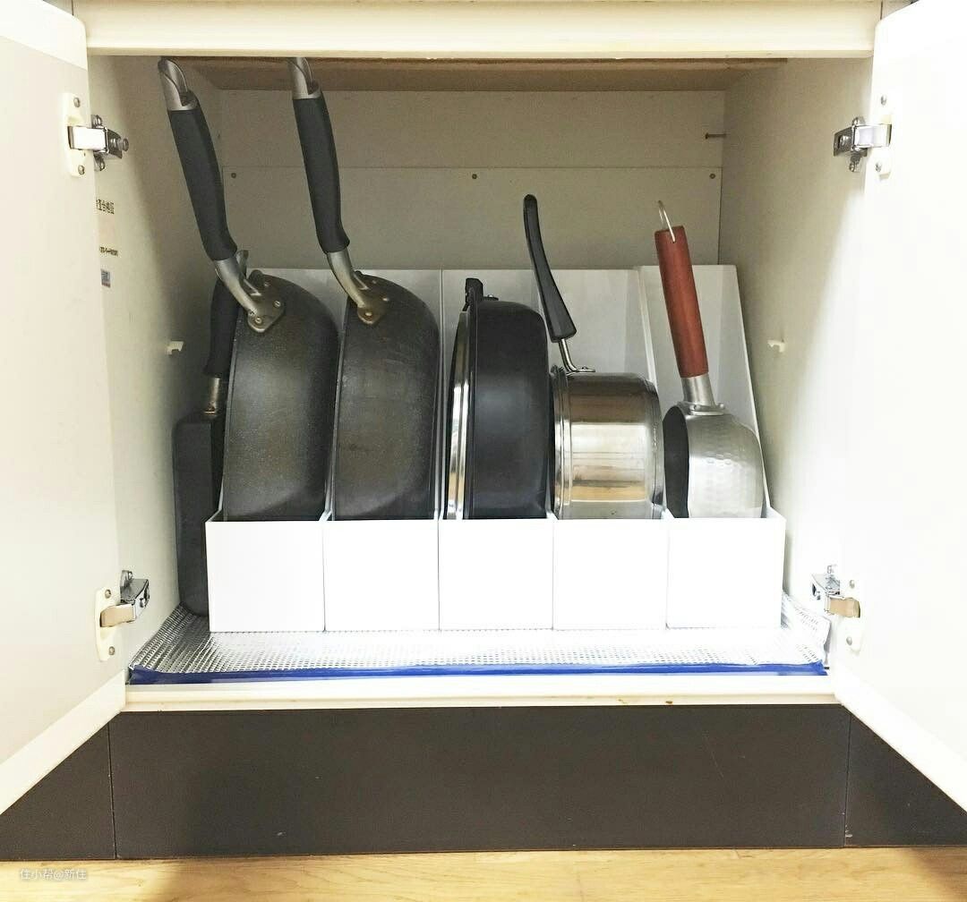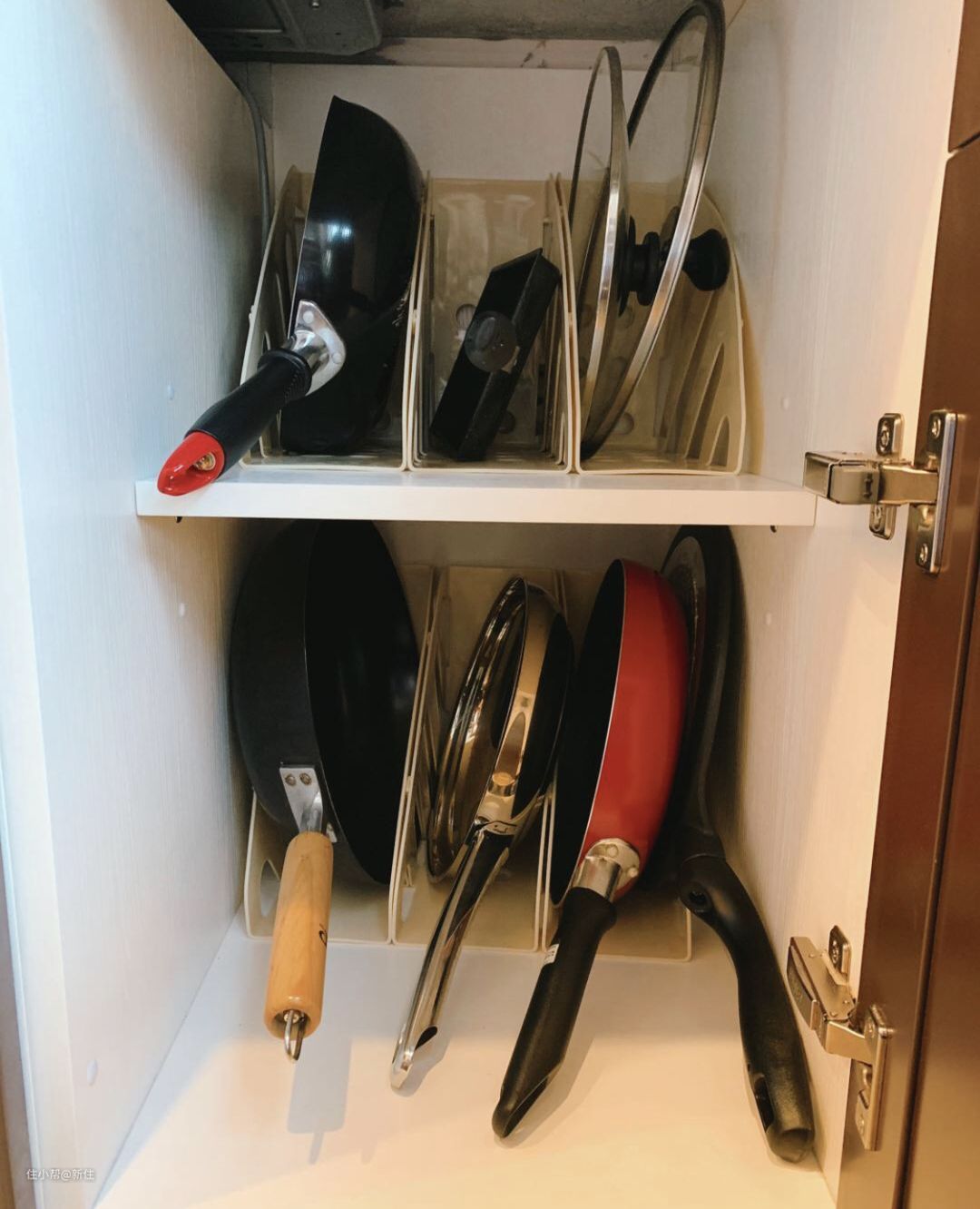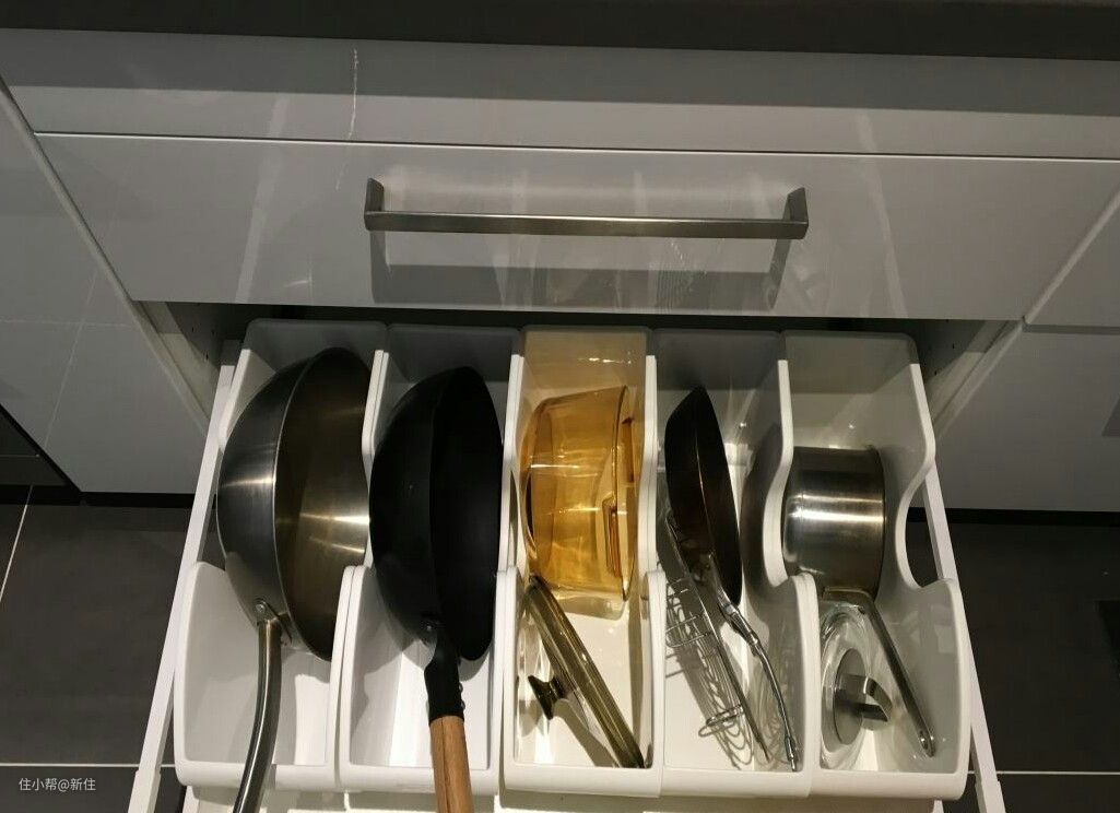 补充:更常用的锅具收纳是带滚轮的日式锅具收纳盒,不管是放抽屉还是橱柜,拿取都非常便捷。