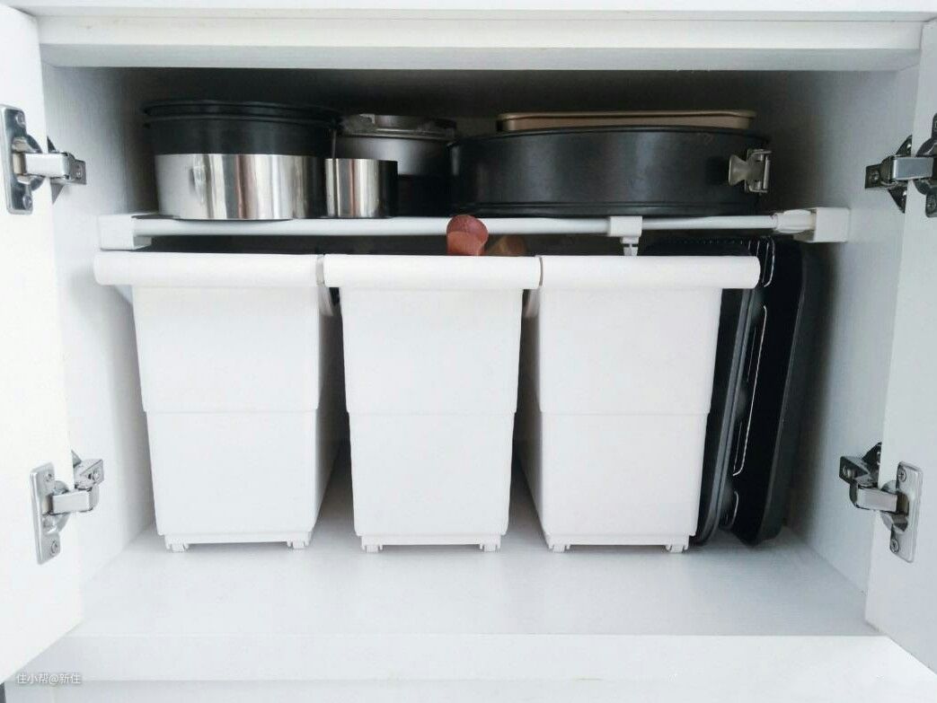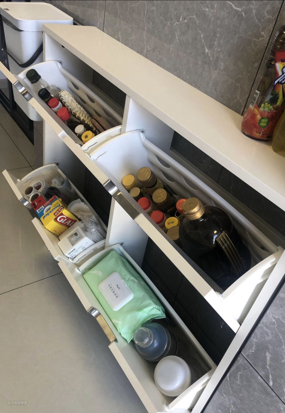 厨房橱柜里用可抽拉收纳盒,上层还有部分空间浪费,用伸缩隔板后还可以收纳蛋糕模具等。