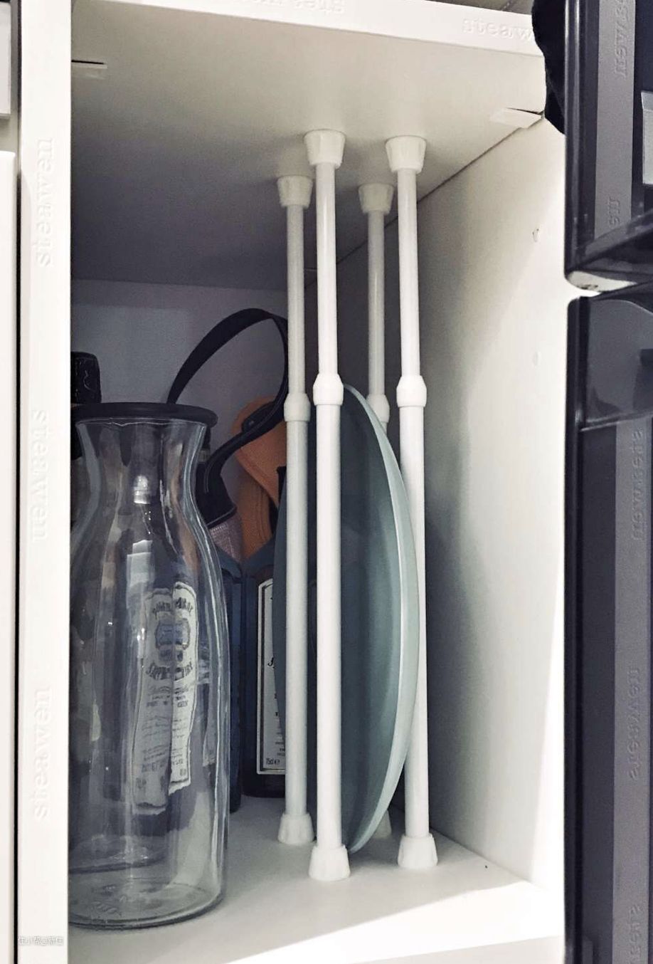 吊柜里竖直放伸缩杆,收纳大盘子或者烤盘,都完全没问题。