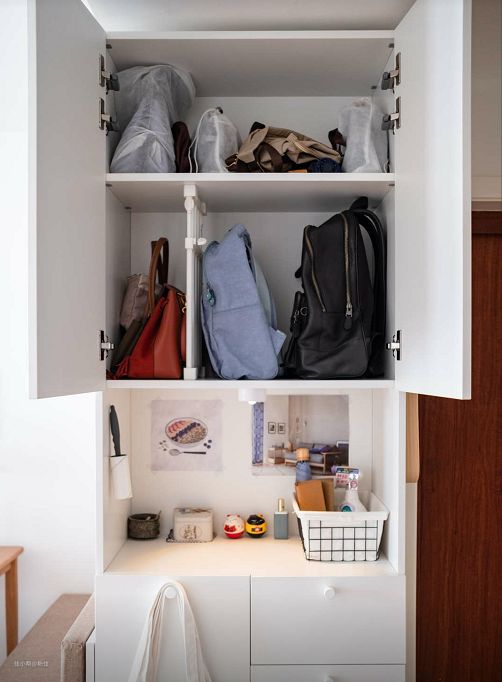 利用裤架的安装方法,安装抽拉杆在柜子内侧,挂上收纳袋,收纳使用频繁的物品。