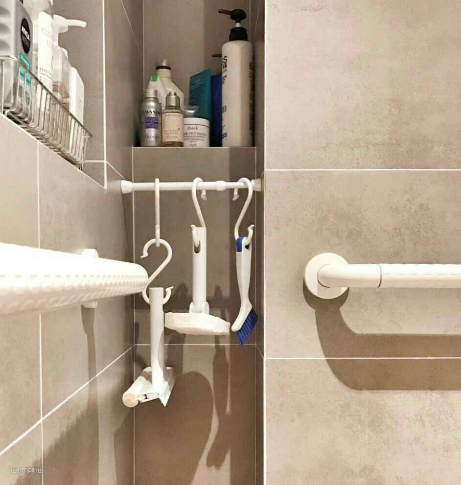 用在浴室两个墙面之间,通过S型挂钩收纳清洁工具。