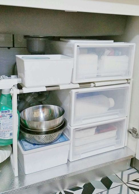 还可以充分压榨下水槽柜空间,来收纳厨房用品。