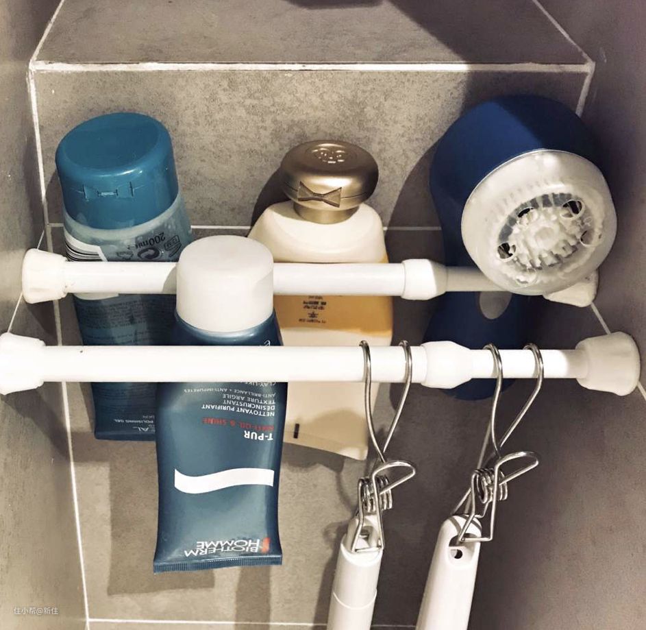 用两根伸缩杆形成面,通过伸缩杆缝隙来收纳洗面奶等。