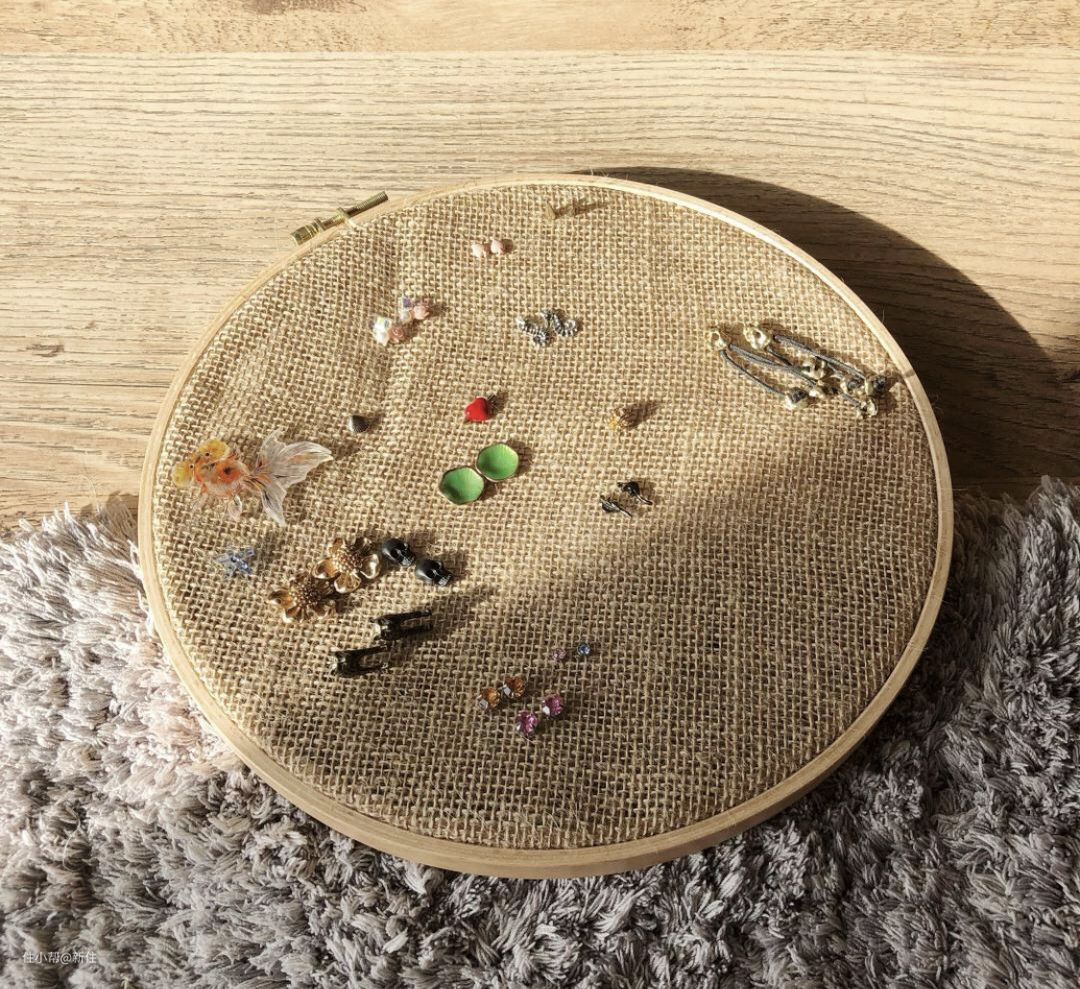 把喜欢的耳环直接扎在绣绷上,挂在梳妆台,平时化妆时候就可以随时取用,方便好找不怕丢。