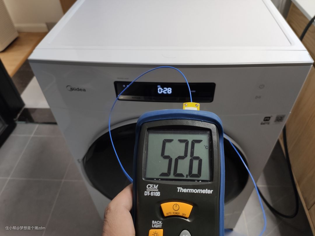 为了测试这台机器在烘干过程中机器内部的温度,我用了一块能外接K型热电偶的测温仪,将热电偶线塞到机器烘干筒里面,这样就是实时观察到里面的温度情况了。