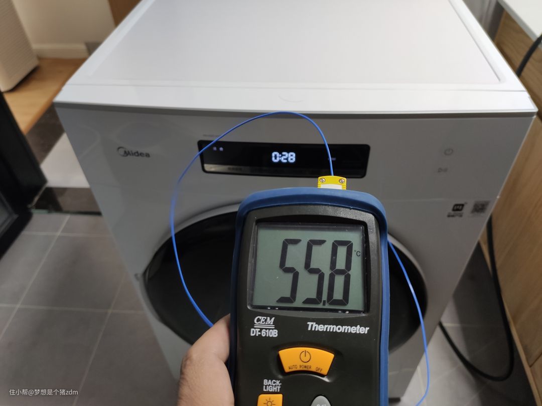 衣物烘干后,打开烘干机门,测得内部温度在62℃左右,和之前用测温仪所测试到的温度相差不大。