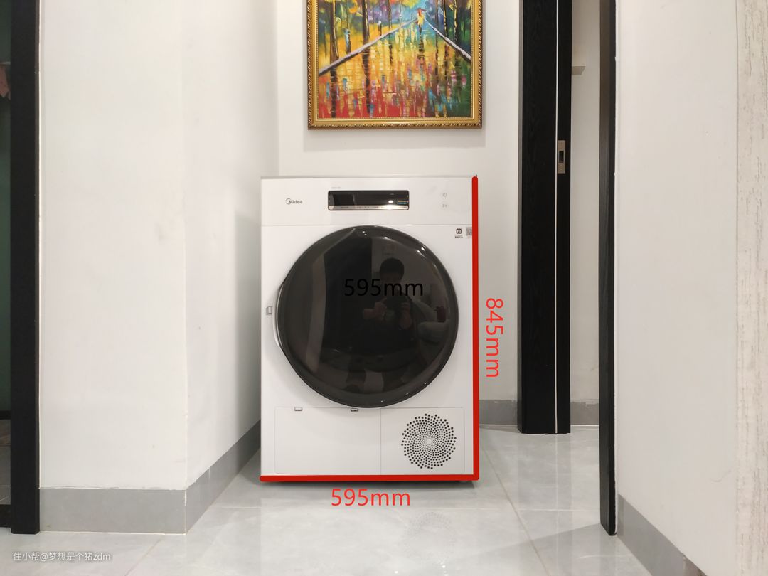 美的初见系列MH100-H1W是新品升级后的10公斤热泵干衣机,机器的尺寸是正面宽度595mm,高度845mm,机器厚度655mm,我测量了一下筒深和直径,约为48mm和58mm。10公斤大容量非常适合五-六口之家,一次性可以烘干两套四件套的床单被套。