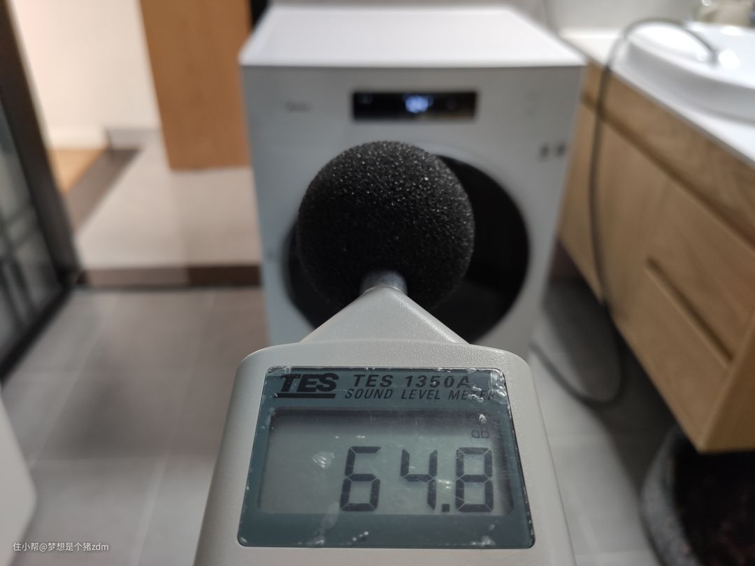在距离烘干机约1米距离,用分贝仪测试,机器的工作噪音在64.8dB左右,这个噪声值如果是在白天使用,还是没有什么问题的,但是如果在深夜时,放在卫生间内使用,可能会对睡眠有影响。