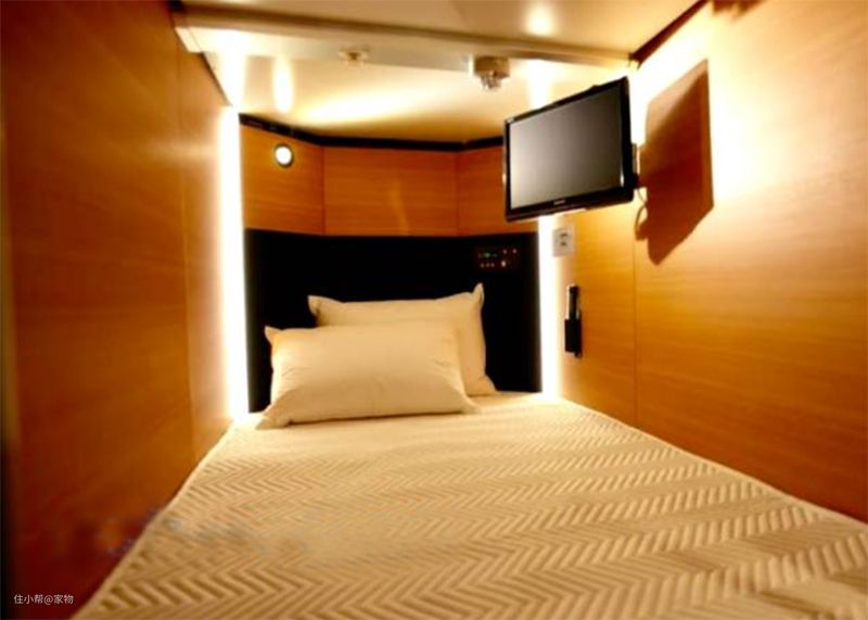 我们首先来看一下胶囊卧室是什么样的吧,卧室整体呈现长方形,只能容纳下一张单人床,床和两侧墙壁之间没有任何空隙,上床的时候是爬上去的,如果层高比较高的话,可以将上层空间也利用起来。