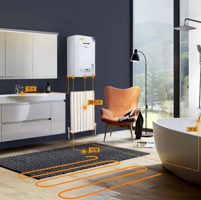 壁挂炉以天然气为燃料,经过燃烧产生的热量由热交换器吸收,随后传递给系统内的循环水,最终由散热层将热量散发到空气中形成供热,为室内提供合适温度。壁挂炉采暖还能提供恒温热水,供厨房和卫生间使用。