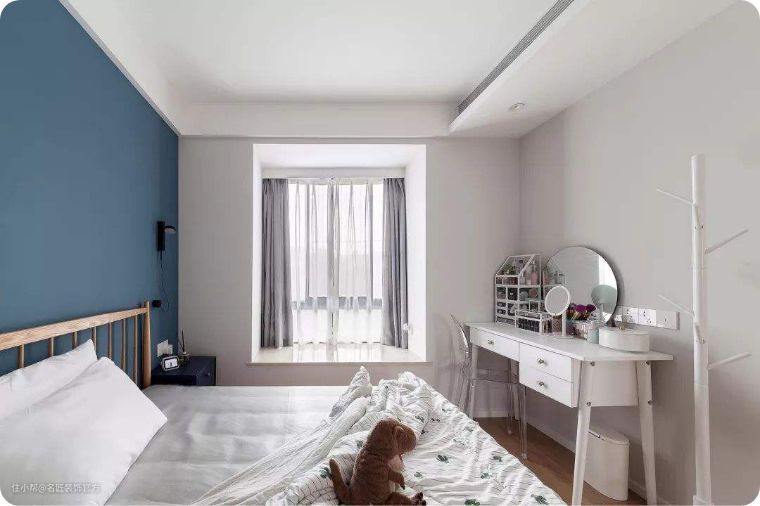 尤其是面积小的卧室,从节省空间的角度出发,可以将梳妆台与其他家具摆放一起,例如与床头柜连成一体。