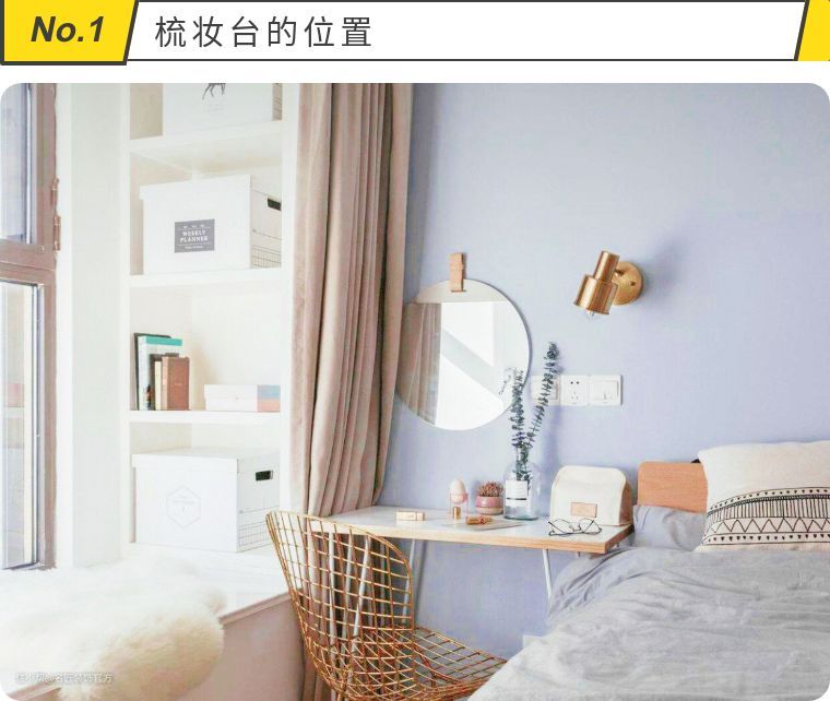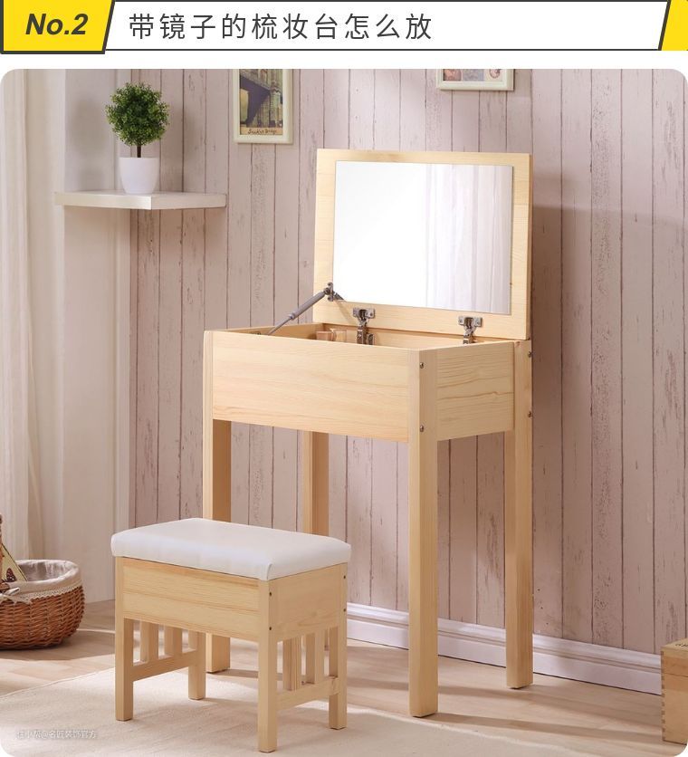 梳妆台最好能够沿着墙边摆放,但是不能靠墙角呈三角的形式摆放,这样是很浪费空间的。