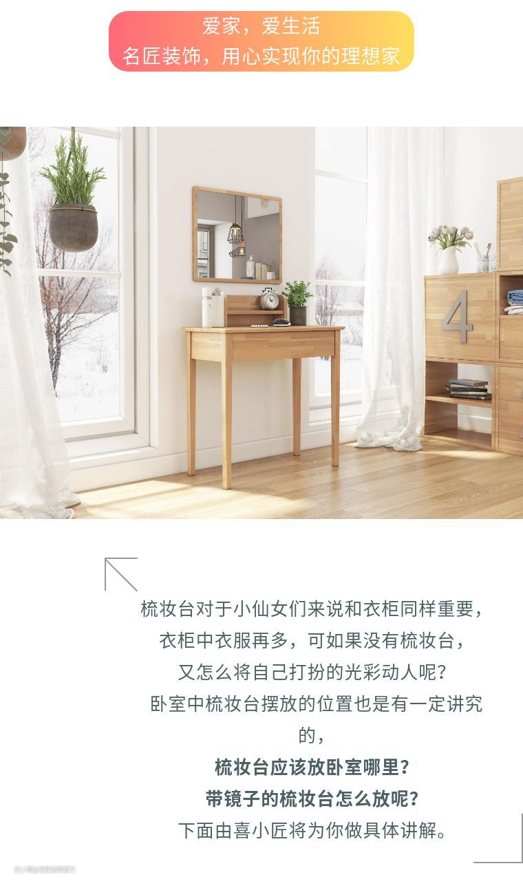 梳妆台一般摆放在卧室,如果是带镜子的梳妆台,可以和床的坐向保持平行一致的状态,形成一种协调平衡的风水磁场。