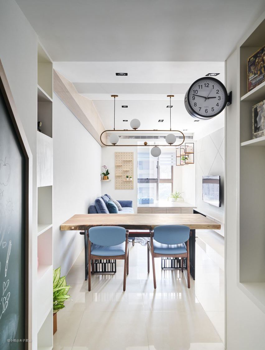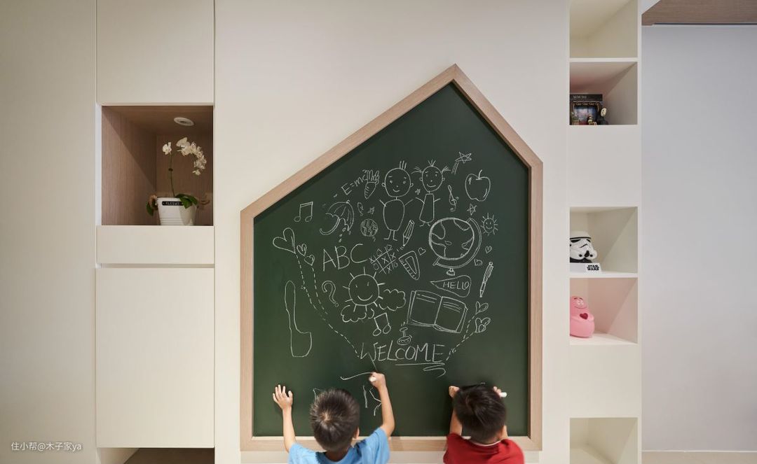 如果你家有2个爱画画的宝宝,那么可以考虑在玄关入门处,或者走廊位置给孩子做一面黑板墙。那会让他们的童年充满涂鸦的快乐,像此案例把黑板墙坐在鞋柜门板,节省空间又可以满足孩子。