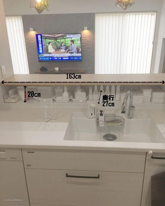 熟悉日本住宅的朋友应该知道,日本厨房大多数为半开放式设计,但又和在中国所见的半开放式厨房不同,在岛台的外侧,她们会进行加高,然后挖了一排洞,做成了一个类似于壁龛的设计,这样你上面和下面都能收纳物品,摆放东西。