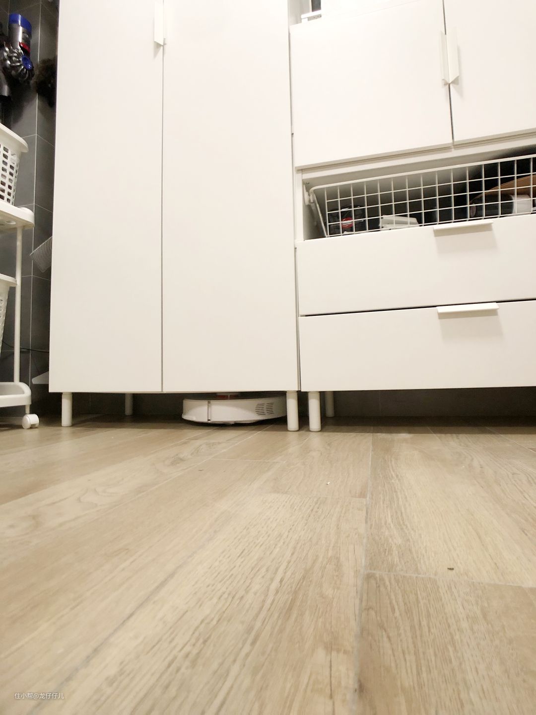 我们家买家具的时候已经尽量考虑到了扫地机器人的高度,各种柜架要么落地,要么柜腿高于11厘米。所以在大部分的区域,基本不需要额外整理,机器人也可以如鱼得水地工作。但是这三个区域存在着种种问题,让我不得不用虚拟墙隔离出来,不让机器人进去清扫。