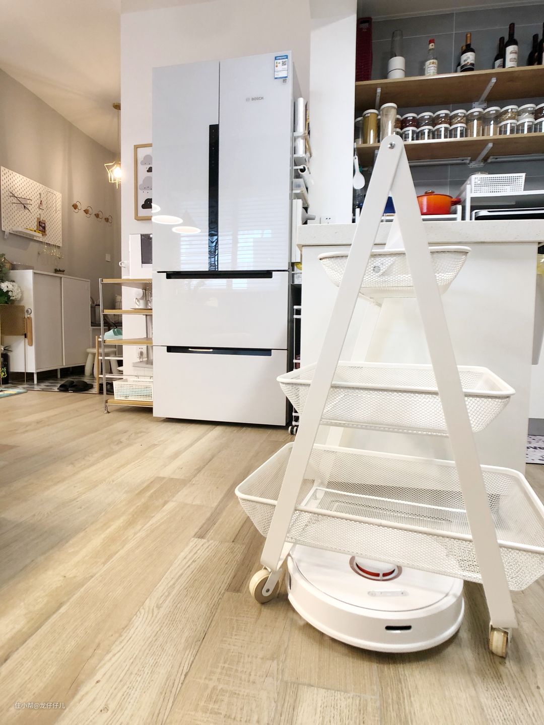 我们家里8个小推车(床头柜、餐具沥水车、蔬果车、脏衣篮、饮料车、健身器材车、园艺工具车、裤架车),前3个都可以让石头T6自由进出。