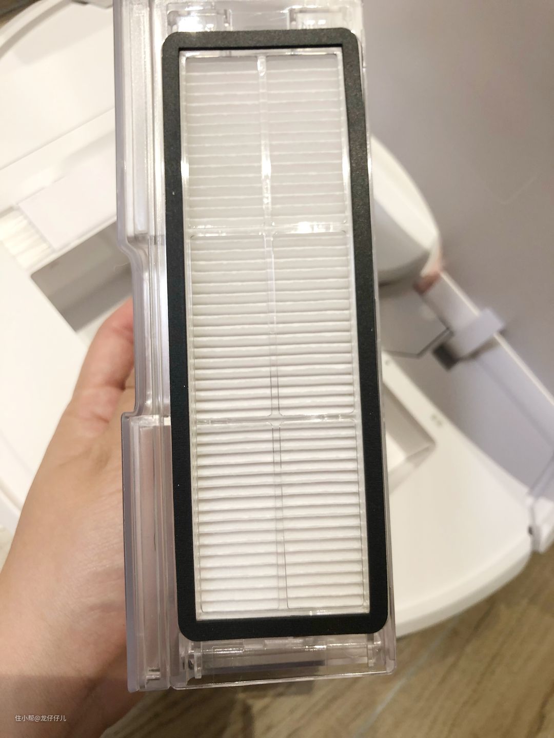 这是清扫前的尘盒(小刷子直接收纳在机器里,人性化程度好评五颗星!),滤网还可以水洗。