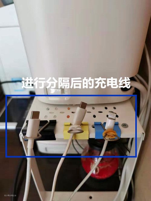 接下来是一个使用中的常见问题,充电线、电脑电源线等这些线怎么整理。开始它们散放在外面我也感觉十分凌乱,而且在拿取的时候会出现线绞在一起的情况。所以我再次使用了一个不算收纳工具的工具——鱼尾夹,我将3个鱼尾夹夹在U型架的边缘,三个充电线的插头穿过鱼尾夹使它们分隔开,每次充电就可以直接抽出相应的充电线使用即可。